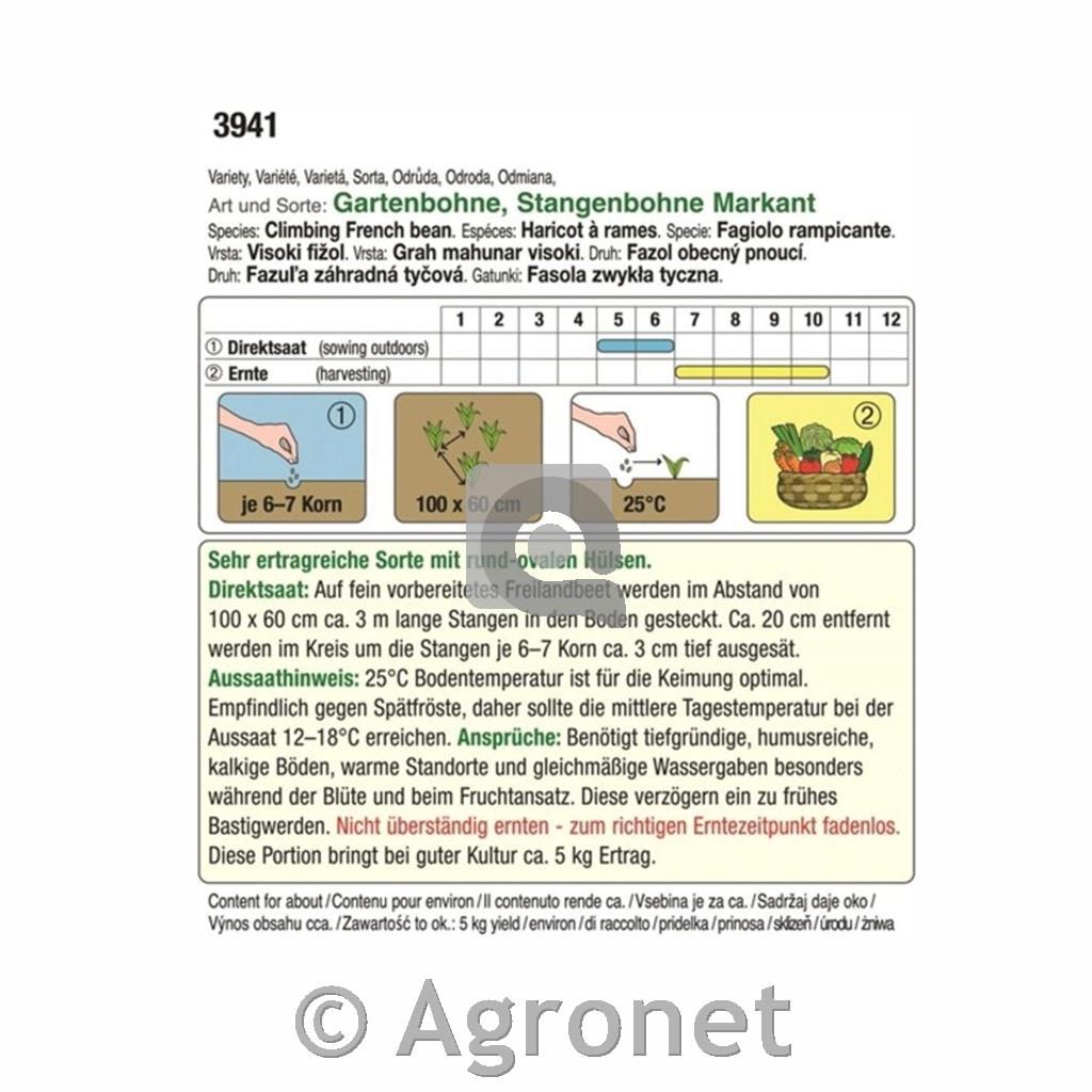 | Seme: hibrid (F1) Kaljenje semena: 10 dni Kaljivost: 88% Vsebina: za 5kg fižola Dimenzija: 11 × 9 × 0,3 cm |