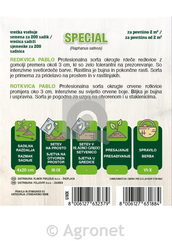 agronet.hr Rastline in semena Semena Zelenjavni vrt Korenovke Redkvica in redkev Redkvica Pablo, 200 semen Cijena:1,69 € Koda:330210759 Težina:0,01kg Marka:L'ortolanoEAN:8006127631884 Zaliha: na zalihi U košaricu KOS